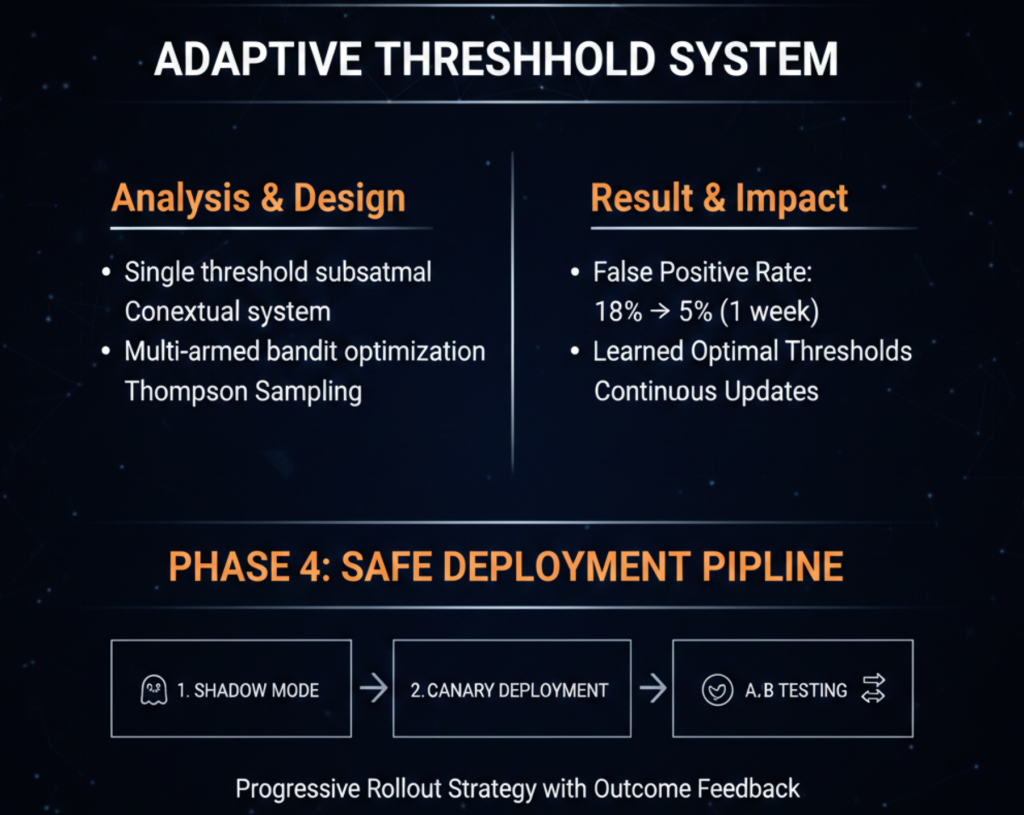 I designed an eight-week implementation plan to address each failure point systematically. The solution required building monitoring infrastructure, feedback collection systems, adaptive decision logic, safe deployment pipelines, and automated retraining.